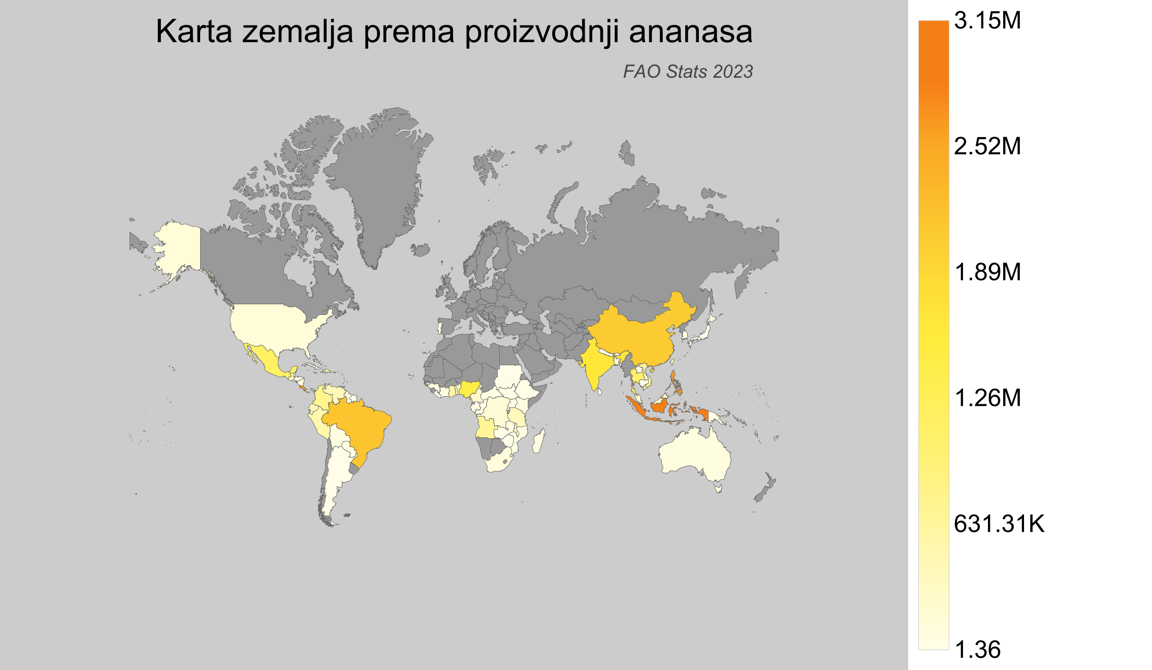 Ananas je izuzetno važna voćka zbog svoje nutritivne vrijednosti i uloge u globalnoj ekonomiji. Najveći dio svjetske proizvodnje ananasa dolazi iz područja s tropskom klimom, koja je idealna za rast ove biljke. Prema najnovijim podacima dostupnim iz baze podataka Organizacije za hranu i poljoprivredu (FAO) za 2023. godinu, ova statistika pruža uvid u globalne trendove.