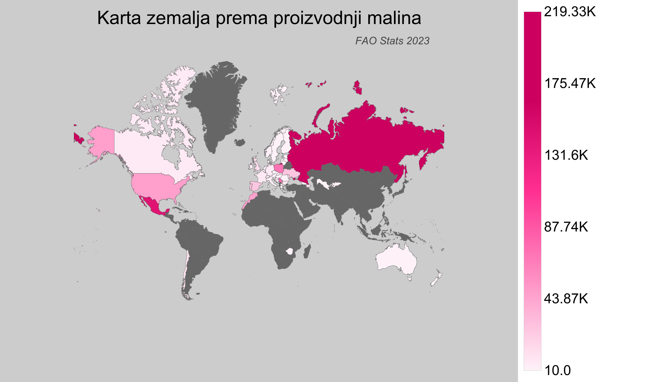 - Ruska Federacija: Proizvela je oko 219 tisuća tona malina, čime je vodeći proizvođač u svijetu.