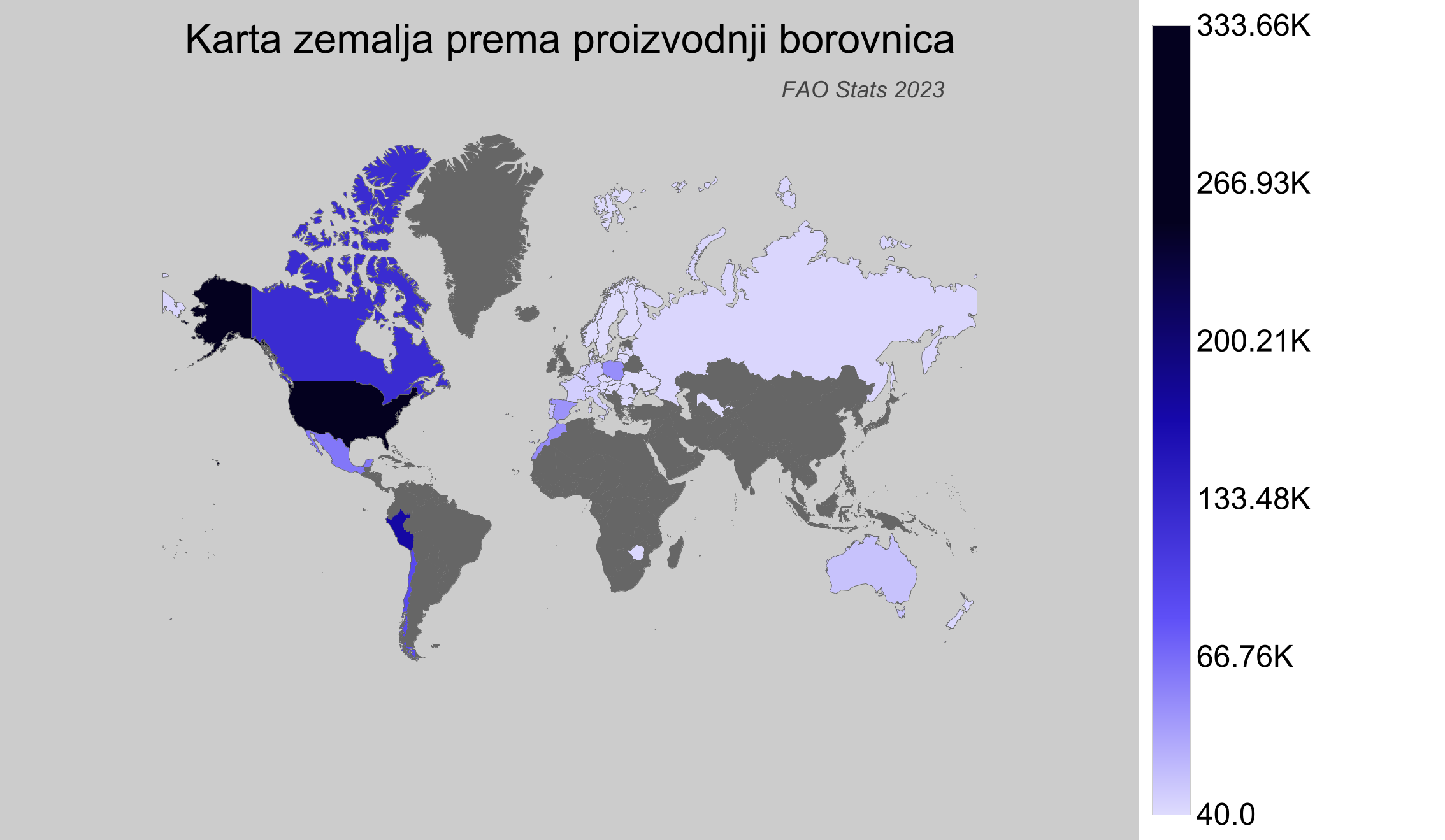 Borovnice su važne zbog svog visokog nutritivnog profila, bogatog vitaminima, mineralima i antioksidansima. Određene vrste borovnica najbolje uspijevaju u umjerenoj klimi s hladnim zimama i blagim ljetima. Podaci za 2023. godinu, prema dostupnim podacima iz baze podataka Organizacije za hranu i poljoprivredu (FAO) iz 2025., pružaju jasan uvid u svjetsku proizvodnju borovnica.