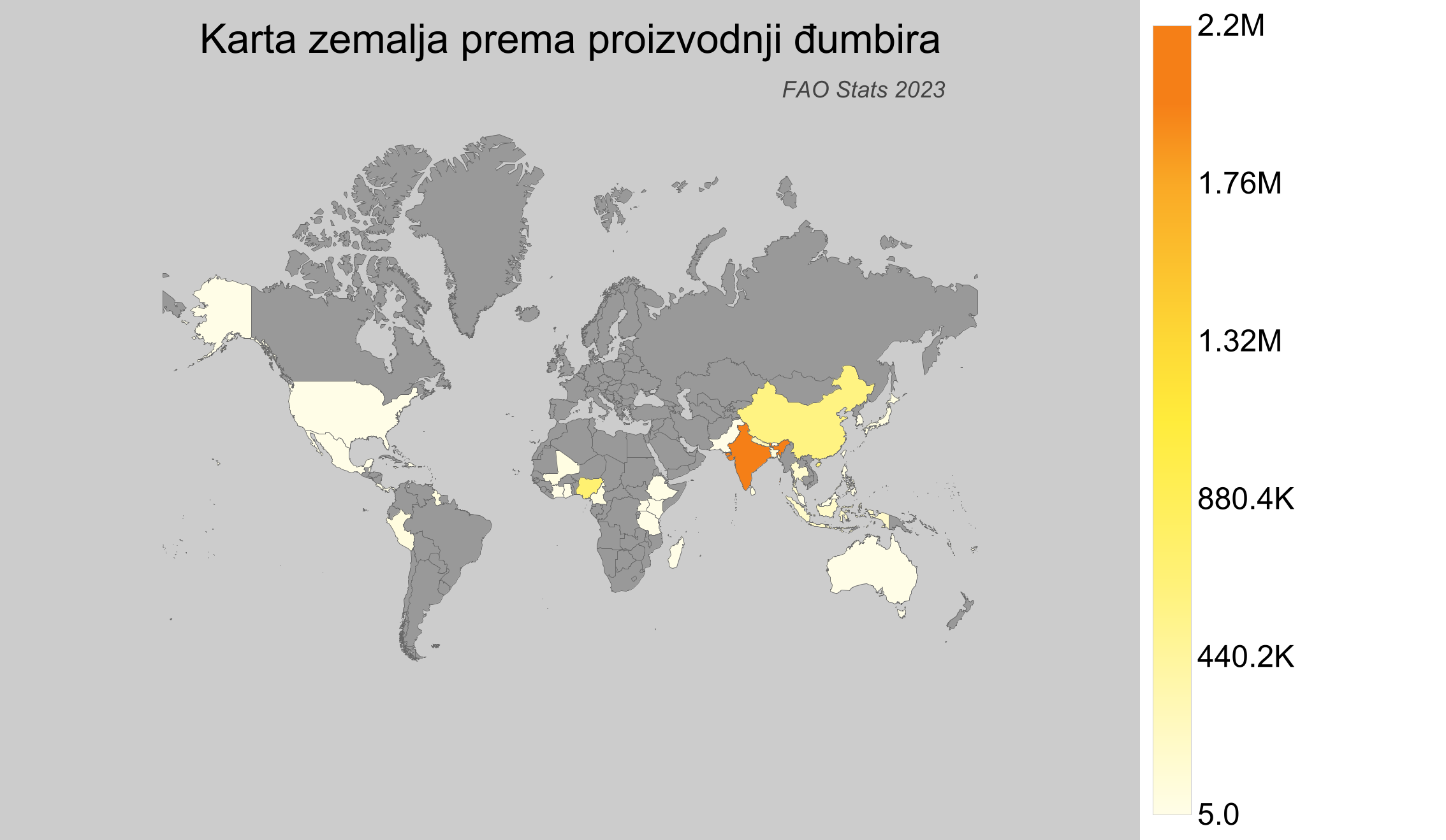 Đumbir je ključni začin koji se koristi diljem svijeta u kulinarstvu i medicini zbog svojih brojnih zdravstvenih koristi. Raste u tropskim i suptropskim krajevima gdje topli i vlažni uvjeti pogoduju njegovom uzgoju. Podaci za 2023. godinu, prema bazi podataka Organizacije za hranu i poljoprivredu (FAO), predstavljaju najnovije dostupne informacije o globalnoj proizvodnji đumbira.